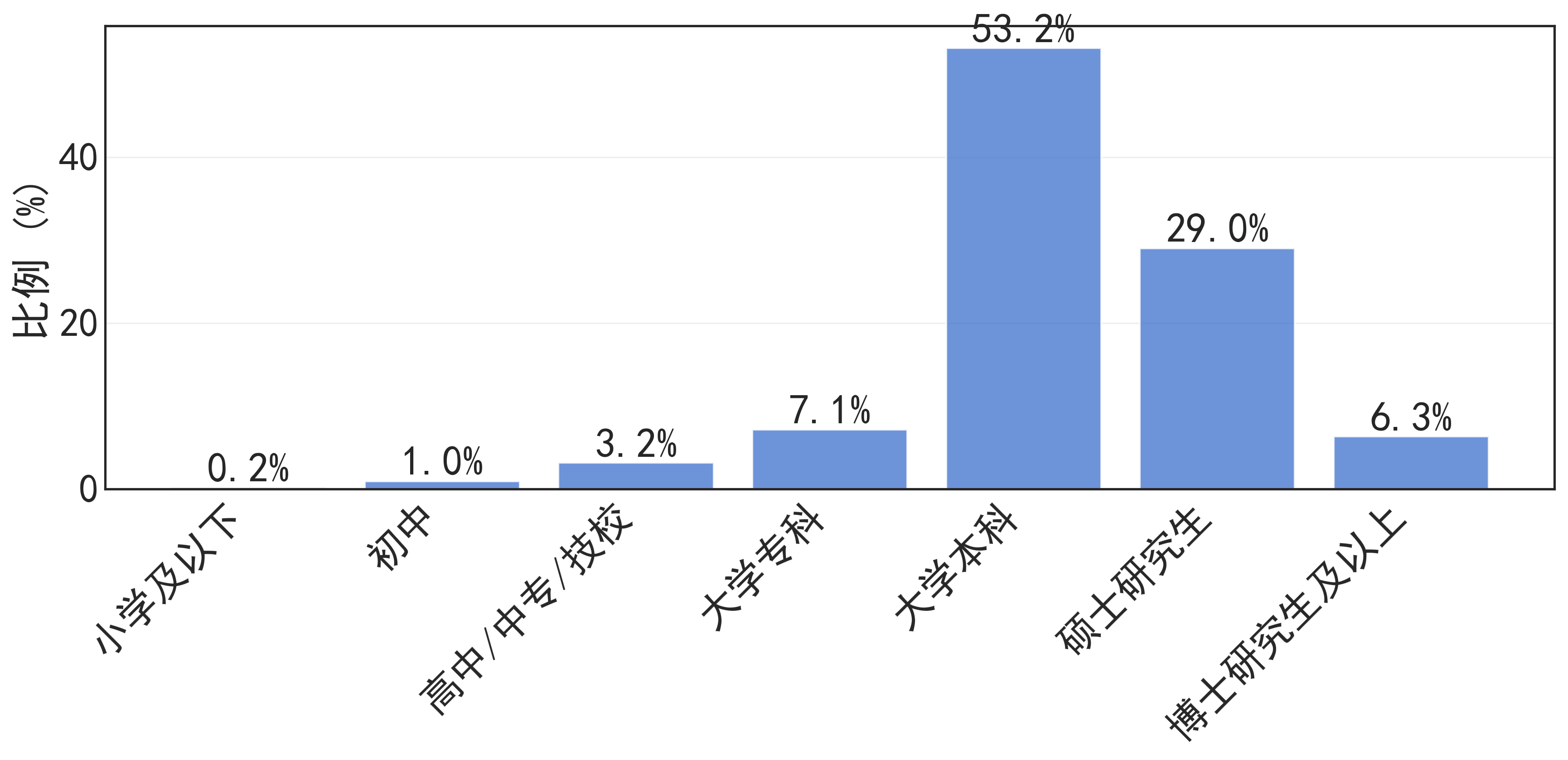 - 教育背景:受访者的学历层次涵盖大学本科、硕士研究生及博士研究生,显示出整体较高的教育水平。