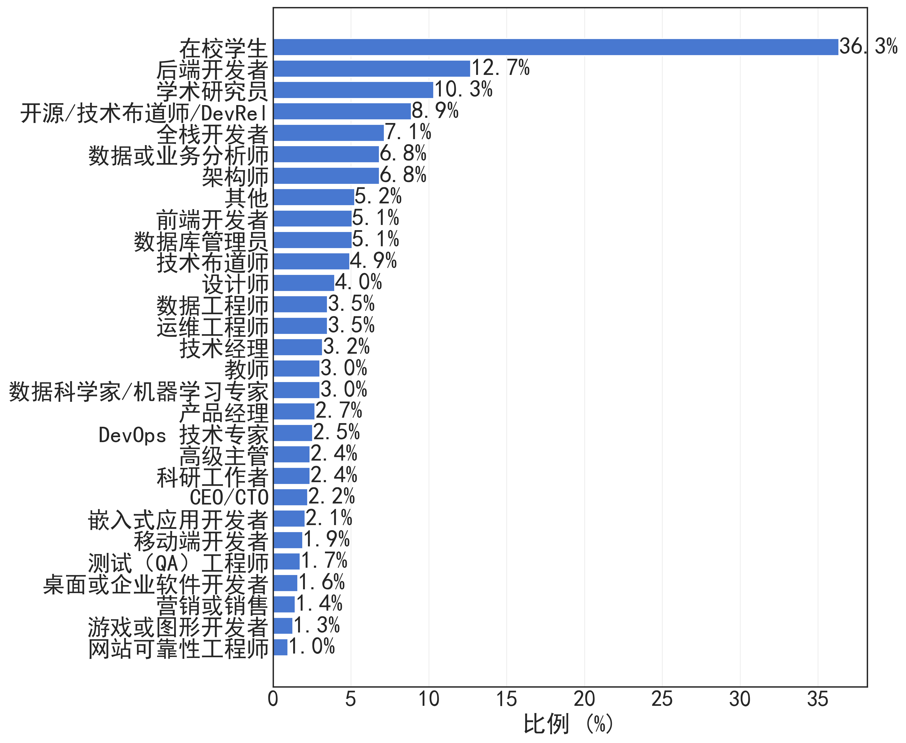 受访者主要分布在互联网 / IT / 电子 / 通信行业,占比达 72.23%,表明调查对象主要涵盖了科技领域。 在职业身份方面,最多的是在校学生,占 36.3%,其次是后端开发者、学术研究员和开源/技术布道师/DevRel。整体而言,调查对象以技术从业人员和学生居多,且涵盖了多个计算机行业职业身份。