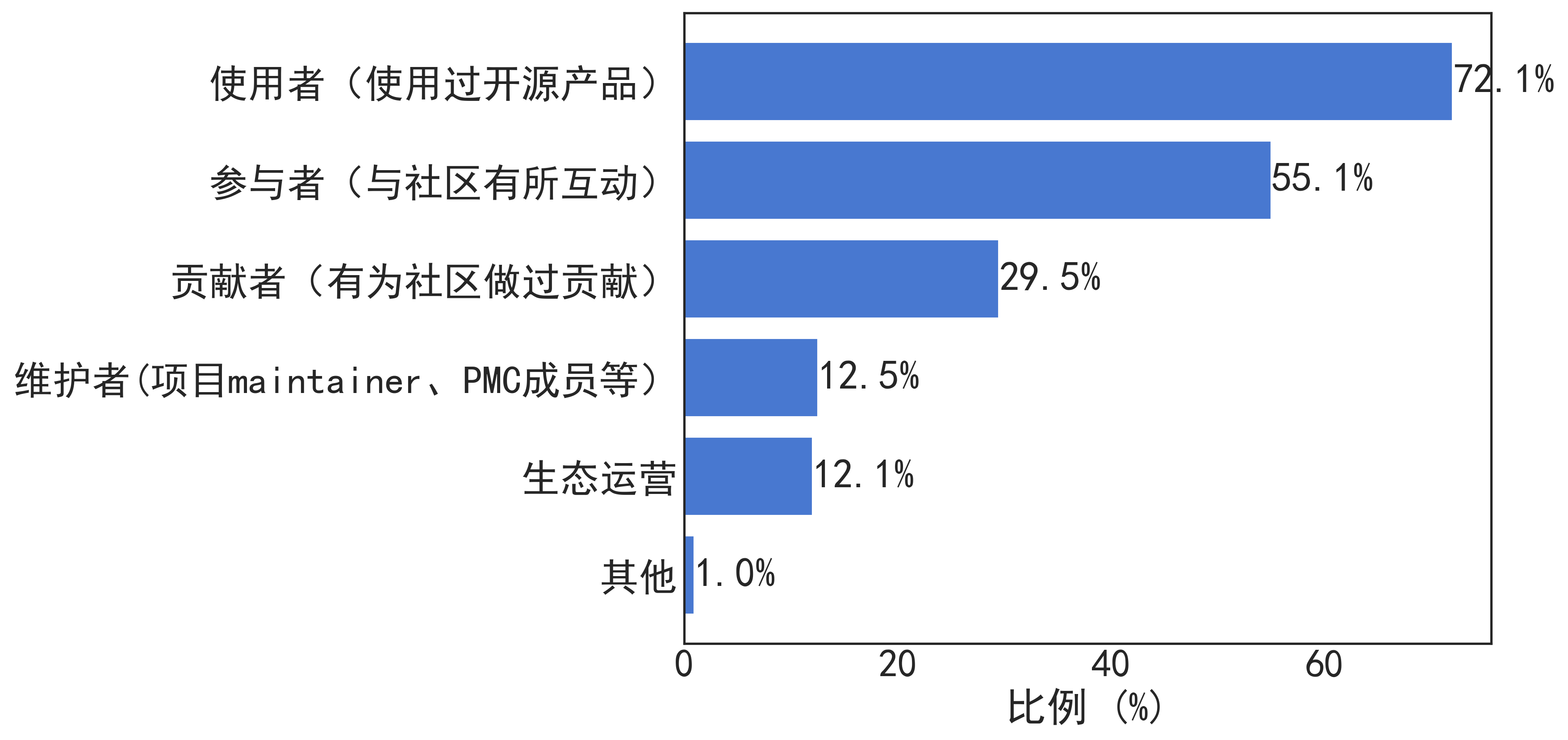 调查显示,开源社区中绝大多数成员为使用者(72.1%),同时有近半数参与者(55.1%)和少部分贡献者(29.5%)。相比较于去年的 26.51%贡献者,今年对开源社区做出了实质性的贡献的比重有所上升。