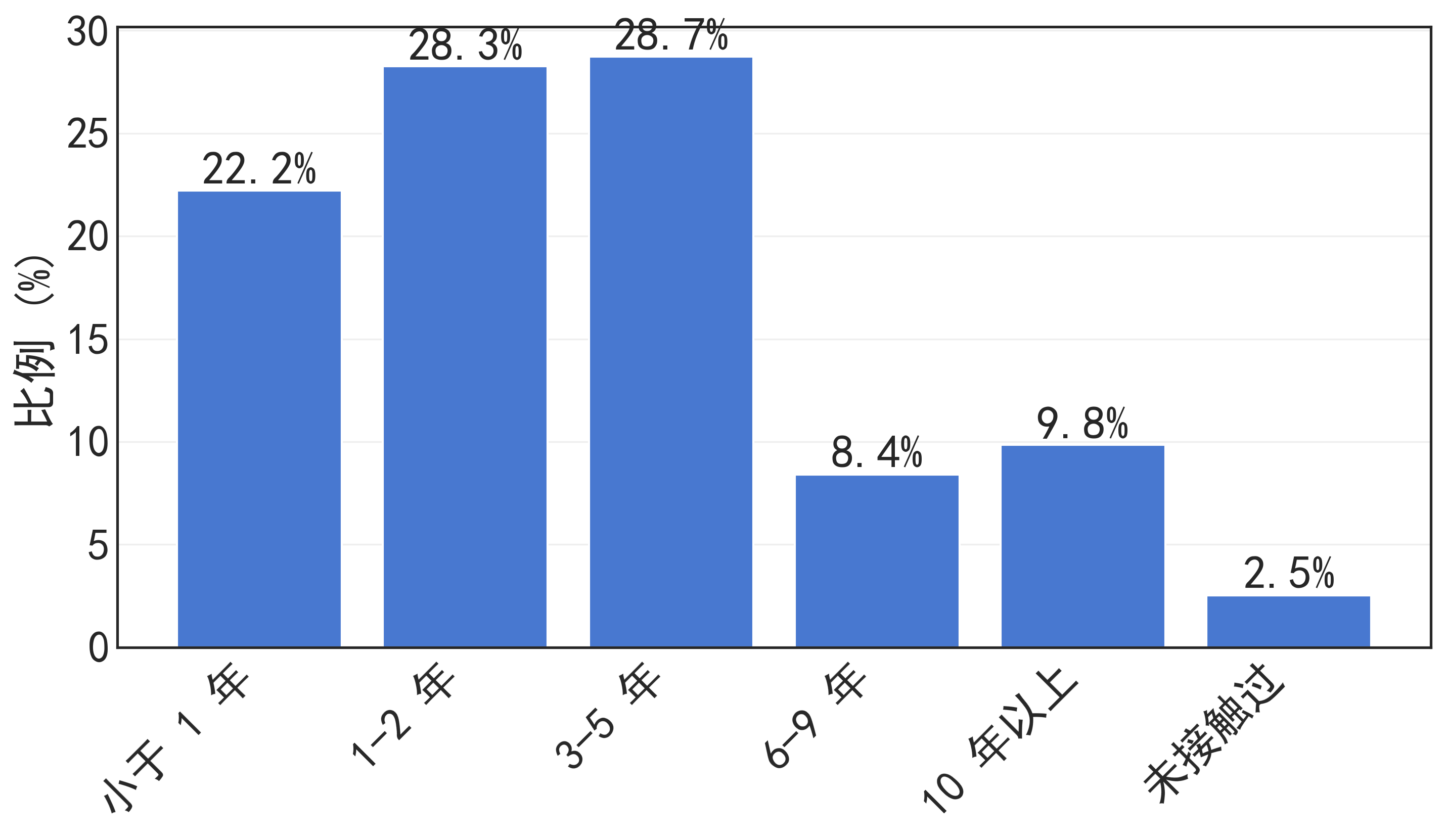 - 开源接触时长:受访者在开源领域的接触时长从少于1年到10年以上不等,显示出开源社区中新老成员的混合。