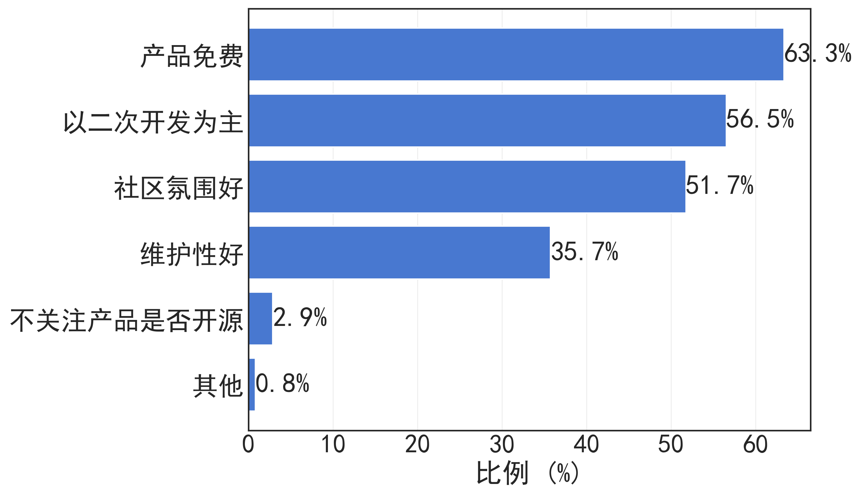 - 开源软件使用原因:受访者使用开源软件的主要原因包括其免费性、可二次开发能力、良好的社区氛围及维护性。