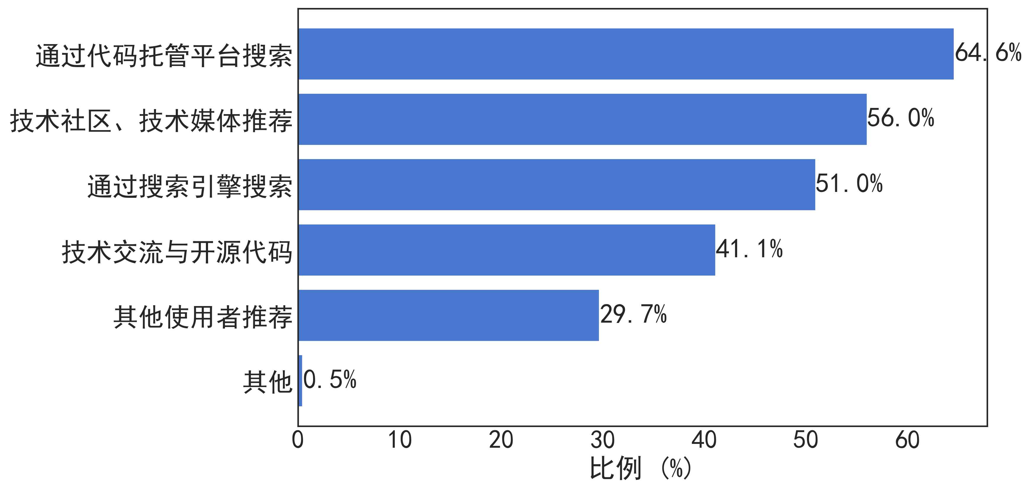 在检索开源产品时,"通过代码托管平台搜索"是最常见的发现途径,占比高达 64.6%。其次是"技术社区、技术媒体推荐",占 56.0%。"通过搜索引擎搜索"的比例为 51.0%,而"技术交流与开源代码"占 41.1%。