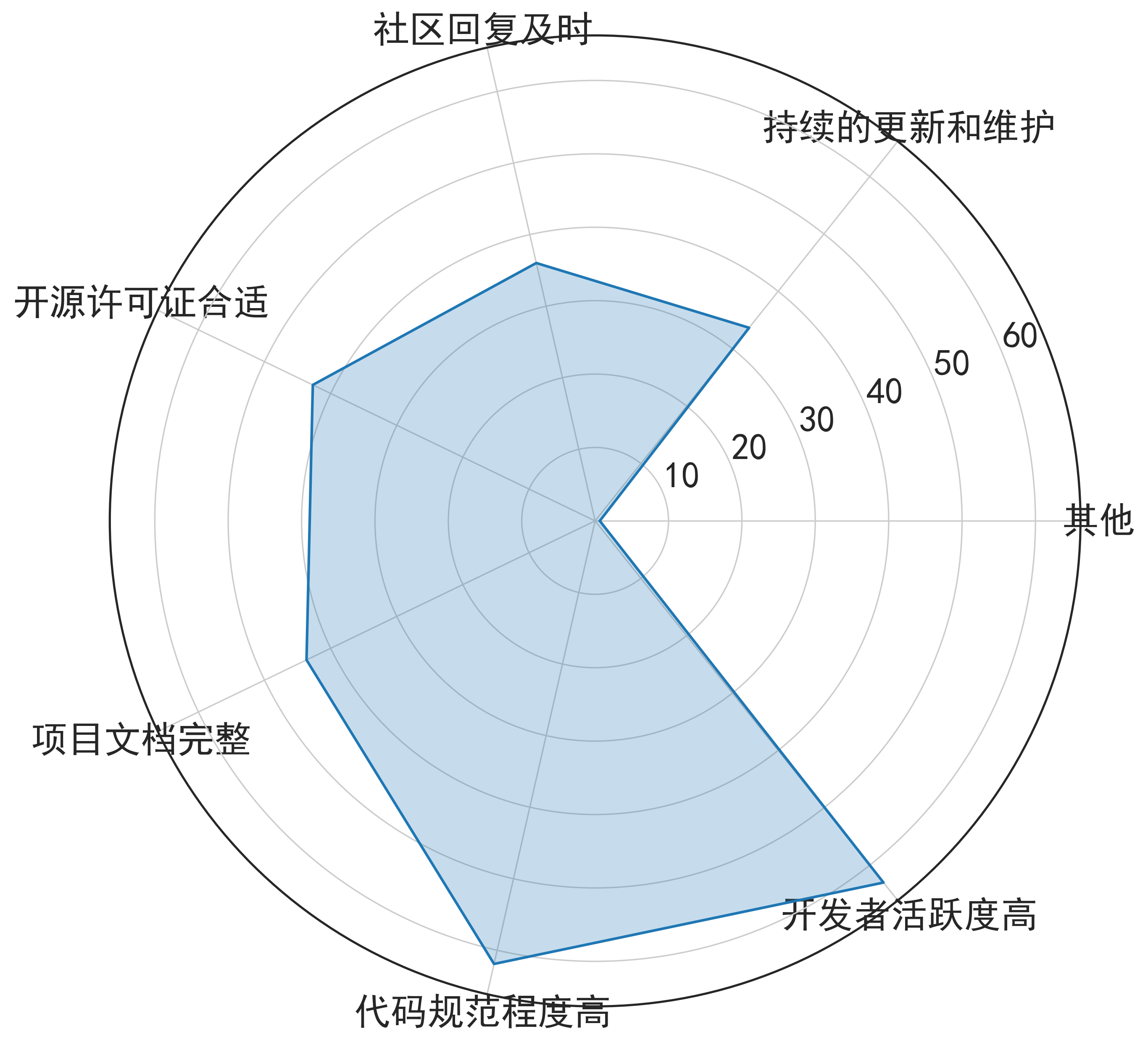 在选择开源产品时,参与者更注重代码规范程度、开发者活跃度。这表明用户不仅关注开源产品的功能和质量,还关注社区和开发者的活跃度以及项目的可持续性。