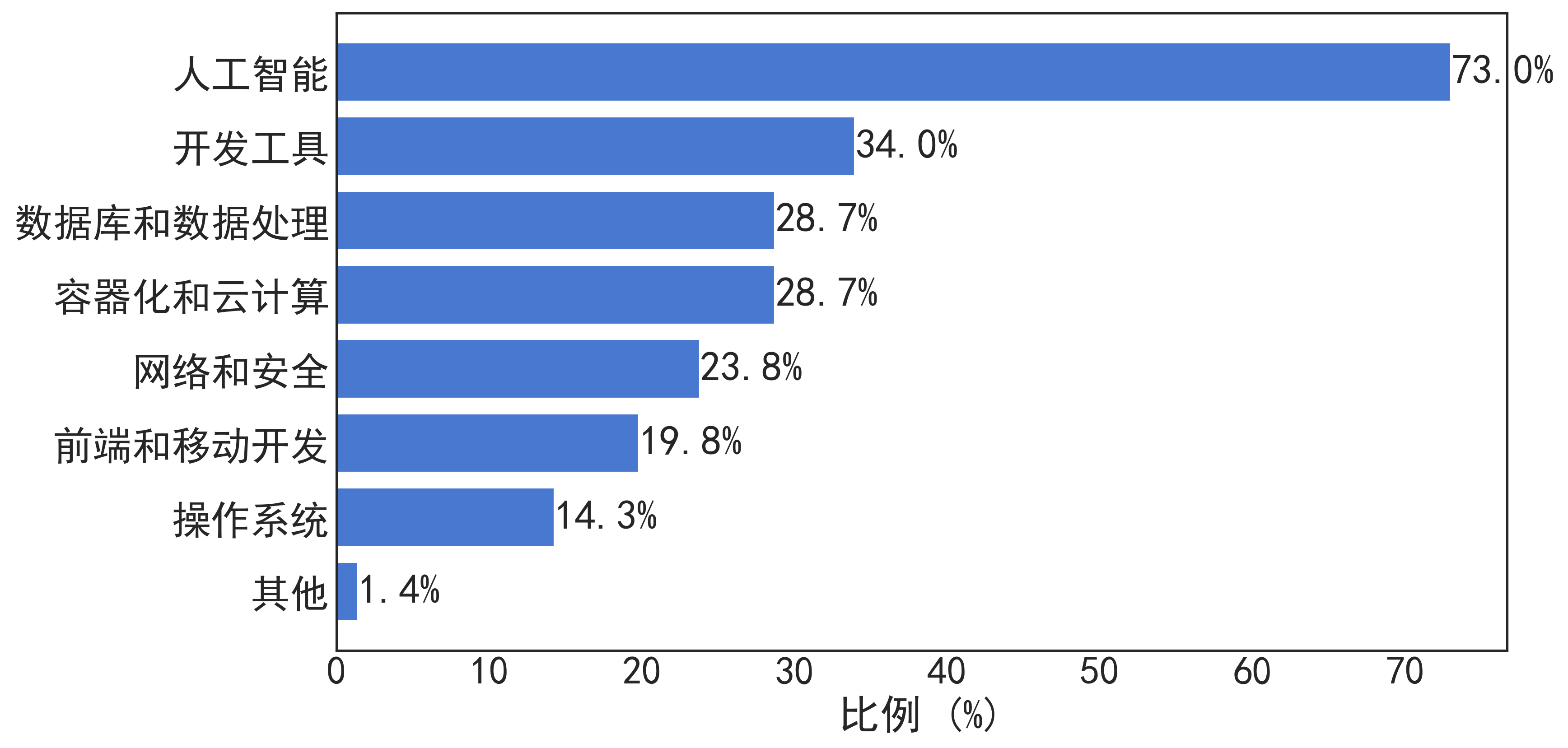 受访者对人工智能表现出强烈兴趣,占 73%,其次是开发工具以及数据库和数据处理。