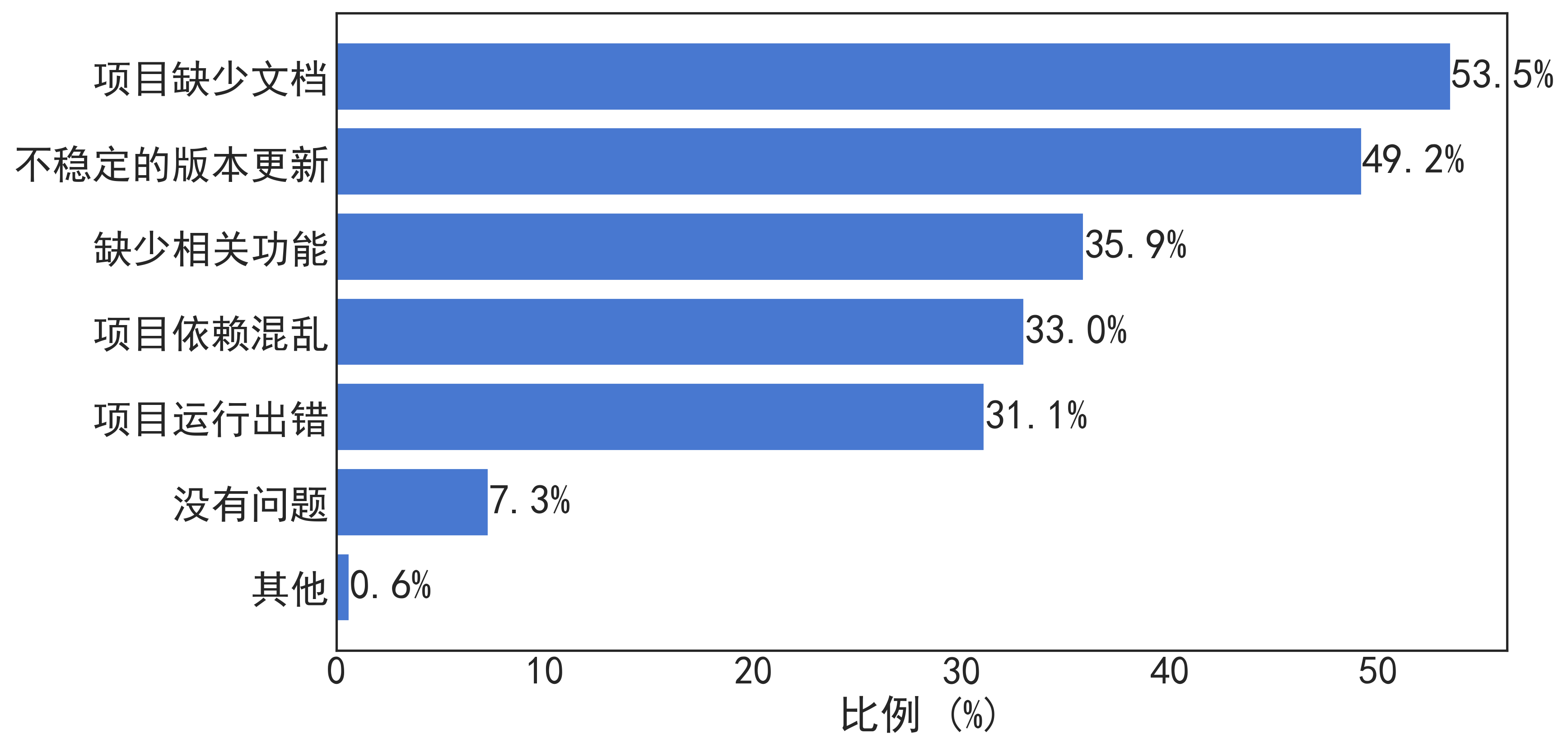 超过半数的受访者都遇到了项目缺少文档的问题,其次是不稳定的版本更新。