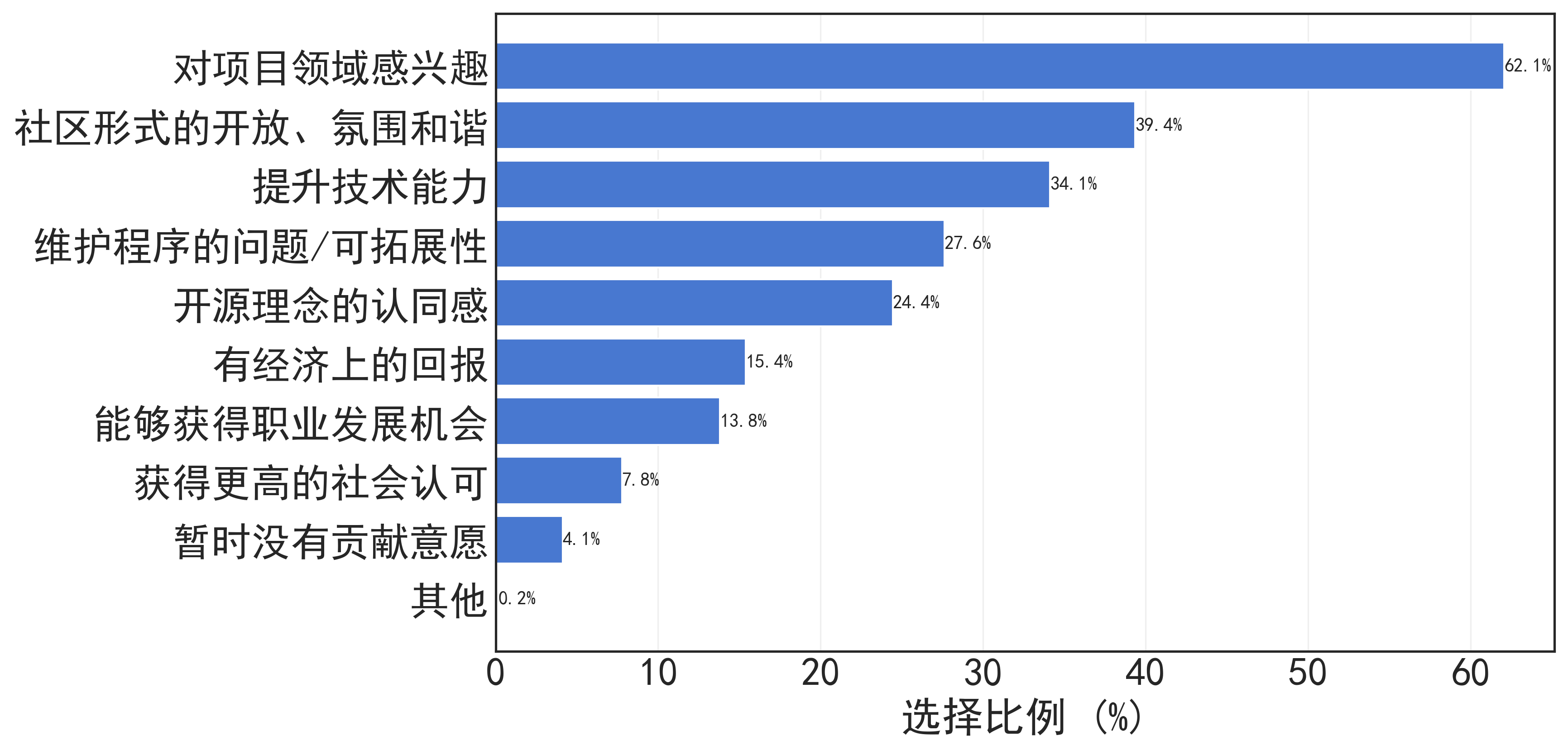 个人兴趣、社区氛围以及提升技术能力等因素在推动开源贡献方面起到了重要作用。