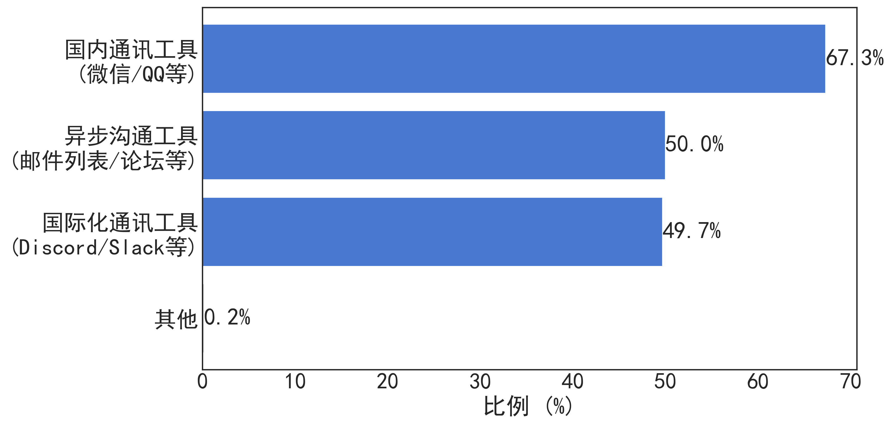 - 社区沟通方式:国际化通讯工具、国内通讯工具及异步沟通工具是受访者与开源社区沟通的主要方式。