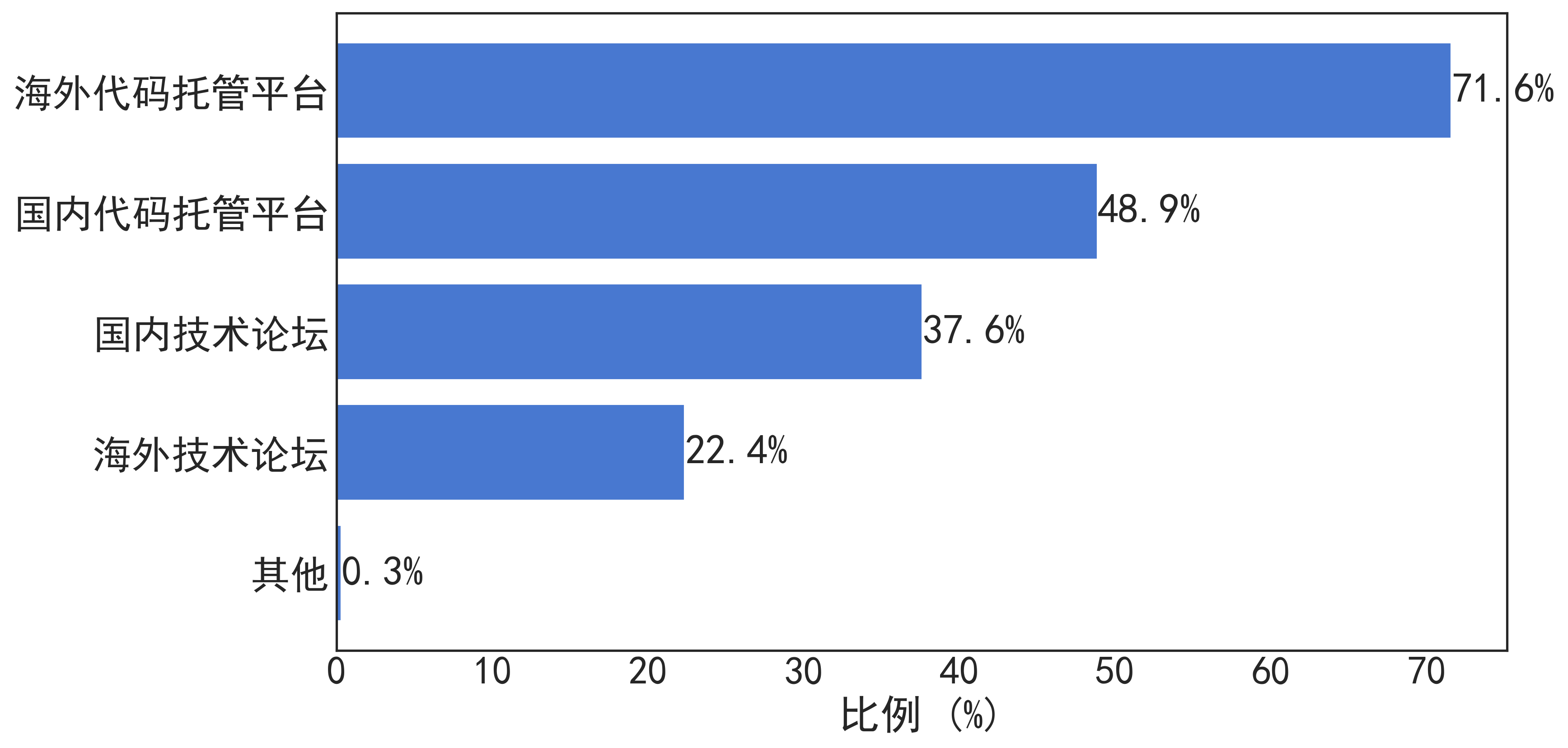 绝大部分受访者主要通过代码托管平台和进行开源社区的参与。此外,还有近半数的受访者还通过国内技术论坛参与开源社区。
