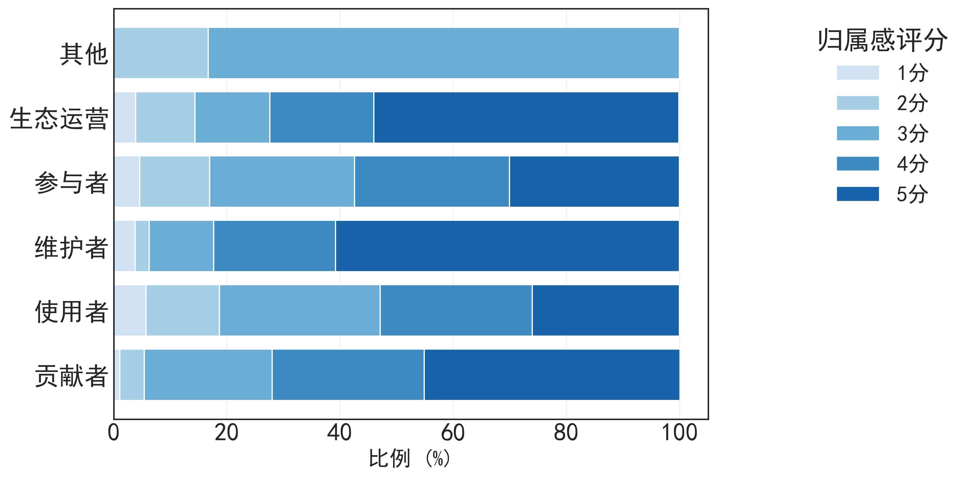 可以看出,开源社区中,维护者、贡献者、生态运营相比参与者、使用者更有归属感。