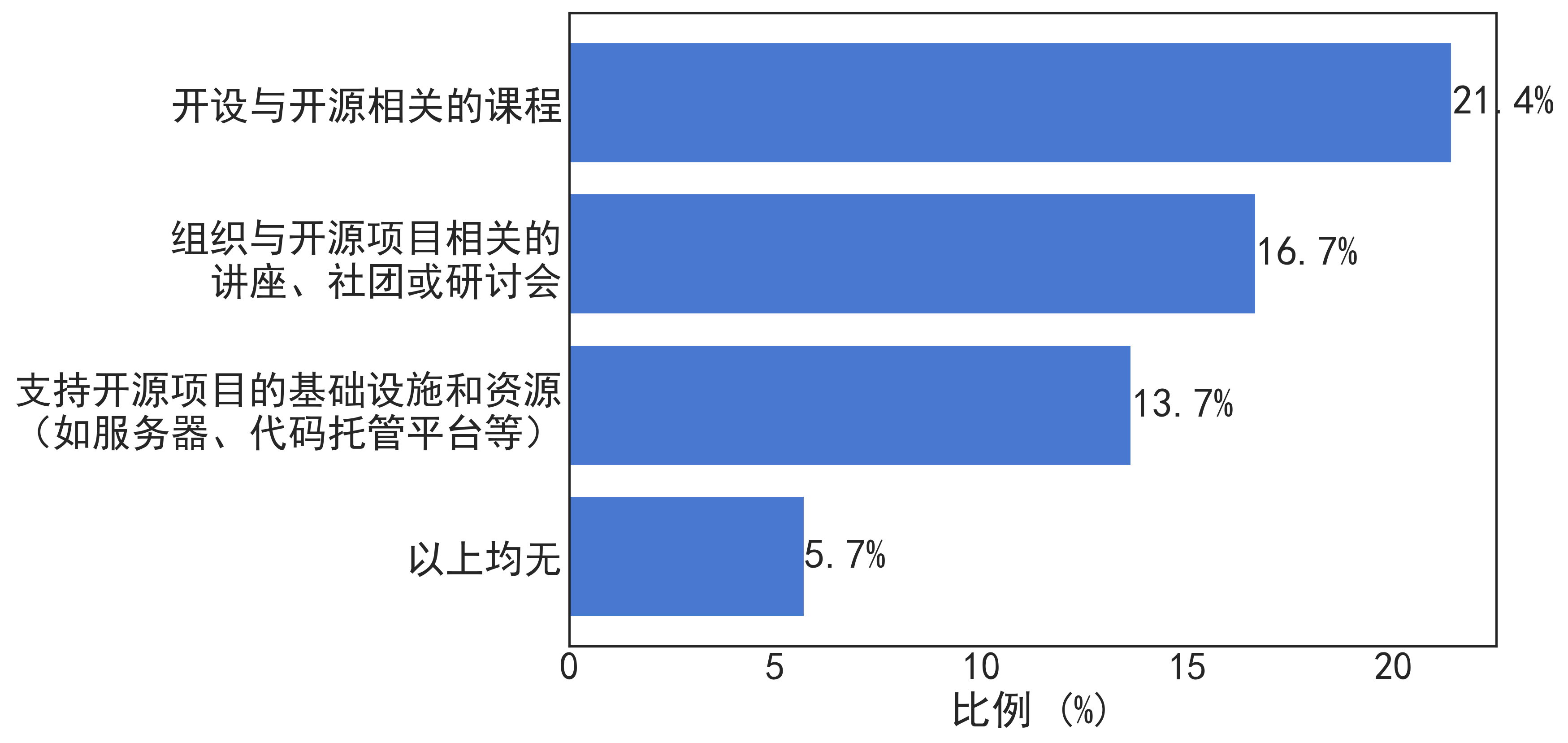 有 21.4%的受访学生所在高校开设了与开源相关的课程,有 16.7%的受访学生所在高校组织了与开源项目相关的讲座、社团或研讨会。另外还有 13.7%的受访学生所在高校支持开源项目的基础设施和资源(如服务器、代码托管平台等)。