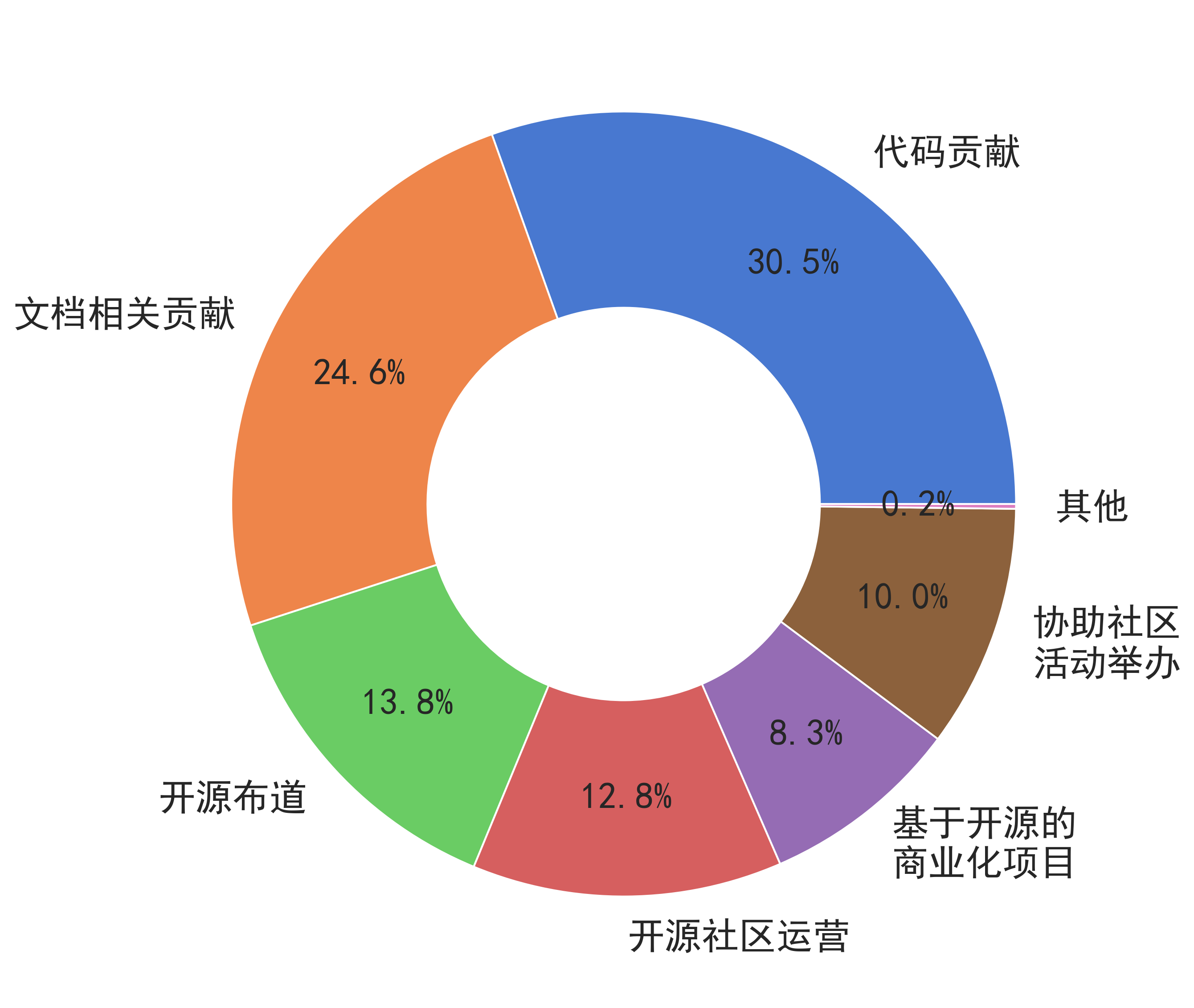 受访者对开源项目的贡献方式呈现多样化,其中“代码贡献”是最主要的贡献方式,占比达到 30.5%。其次是“文档相关贡献”,占 24.6%,这说明文档的编写和维护也是开源项目中不可或缺的一部分。接下来是分别是"开源布道"占 13.8%,"开源社区运营"占 12.8%,"协助社区活动举办"占 10.0%,"基于开源的商业化项目"占 8.3%。