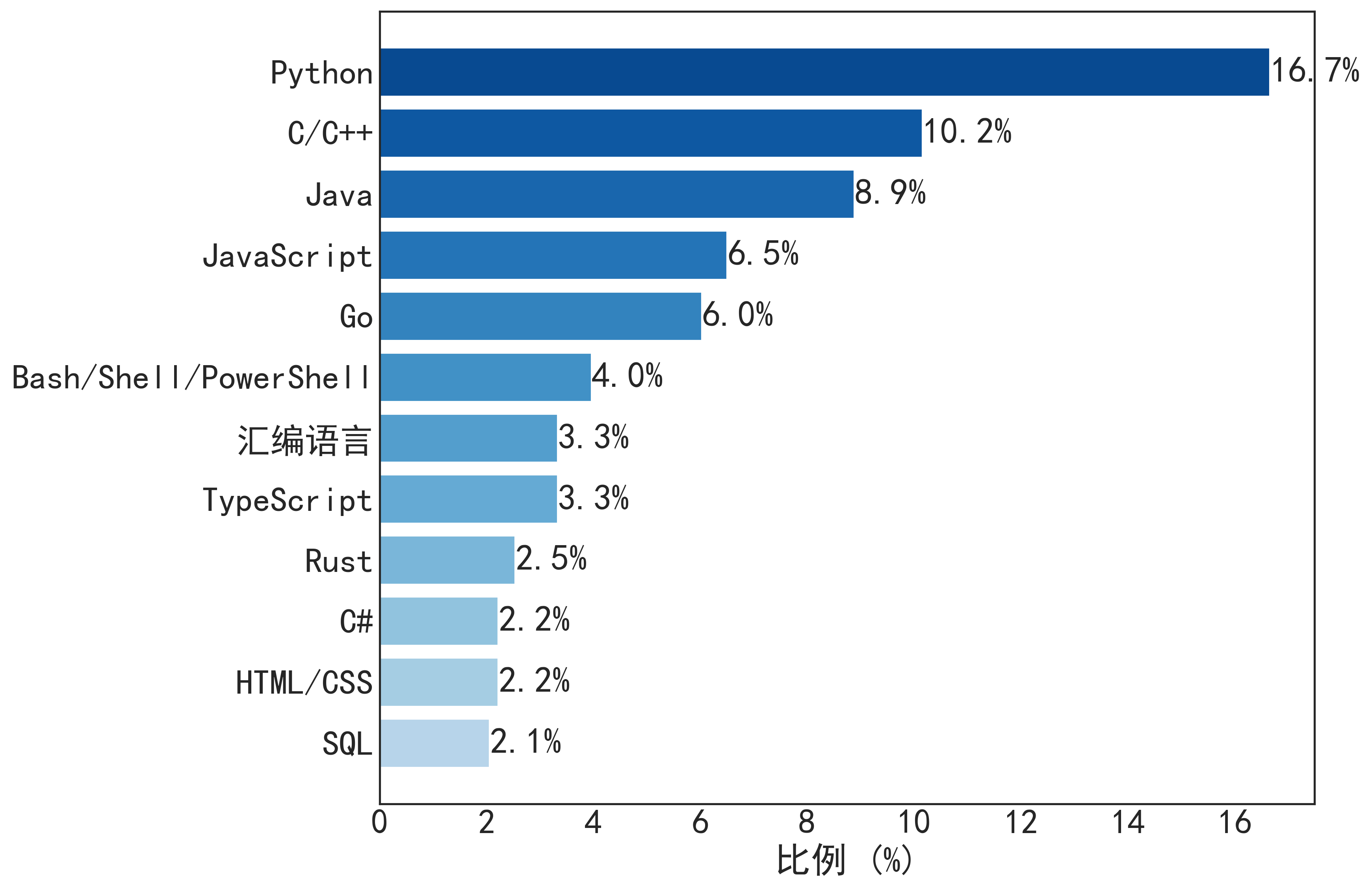 GitHub 仍是最受受访者青睐的平台,占据主导地位,其次是 Gitee 和 GitLab。表明在国内开发者中,GitHub 的影响力仍然很大,但国内平台也在逐渐崭露头角。 主要使用的开发语言包括 Python、C / C++、Java、JavaScript、Go。此外,汇编语言、TypeScript 等也获得了较高的选择次数。