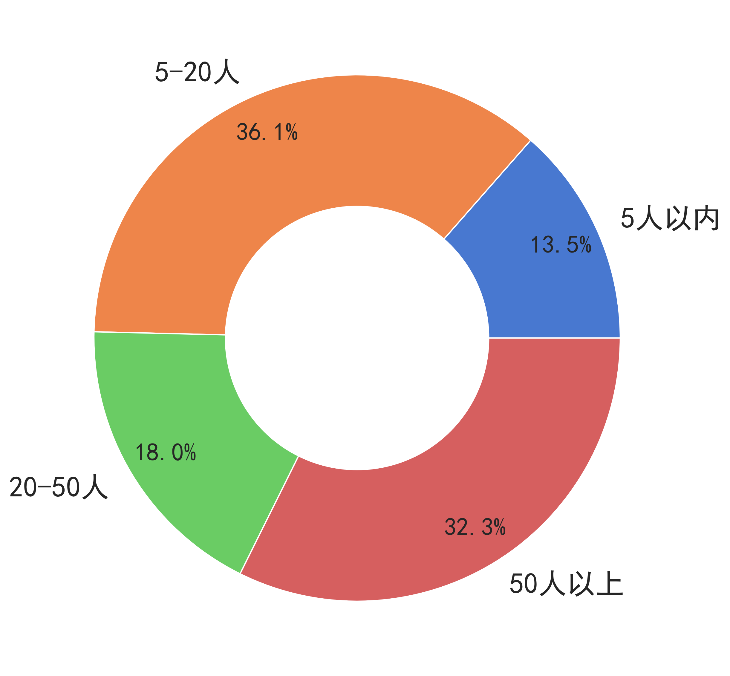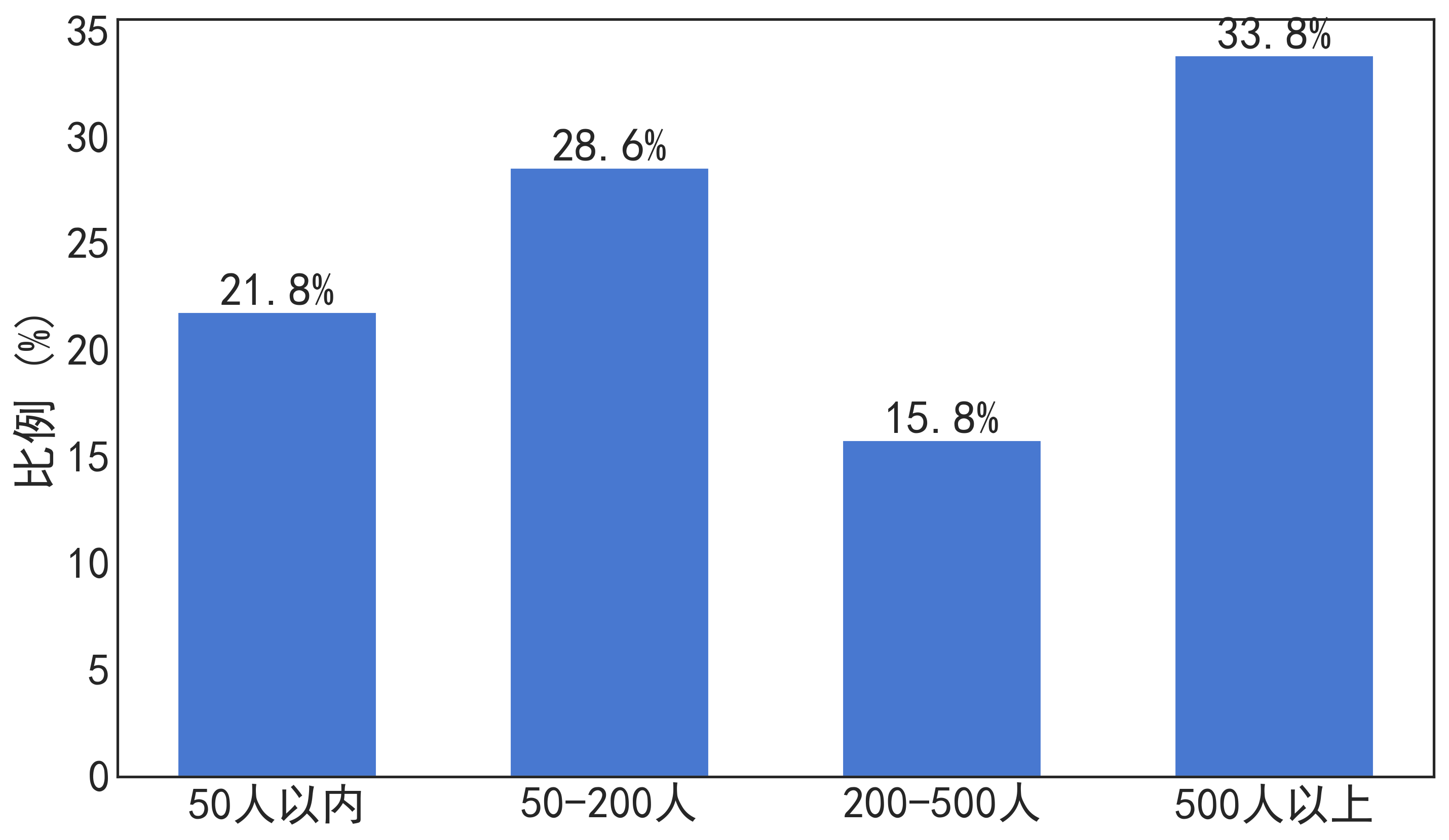 开源社区用户规模以中小型社区为主,其中接近 50%的运营者所在的开源社区用户数量小于 200 人,其中 50 人以内的社区占比 21.8%,50-200 人的社区占比 28.6%。超过 30% 的社区用户数量超过 500 人。