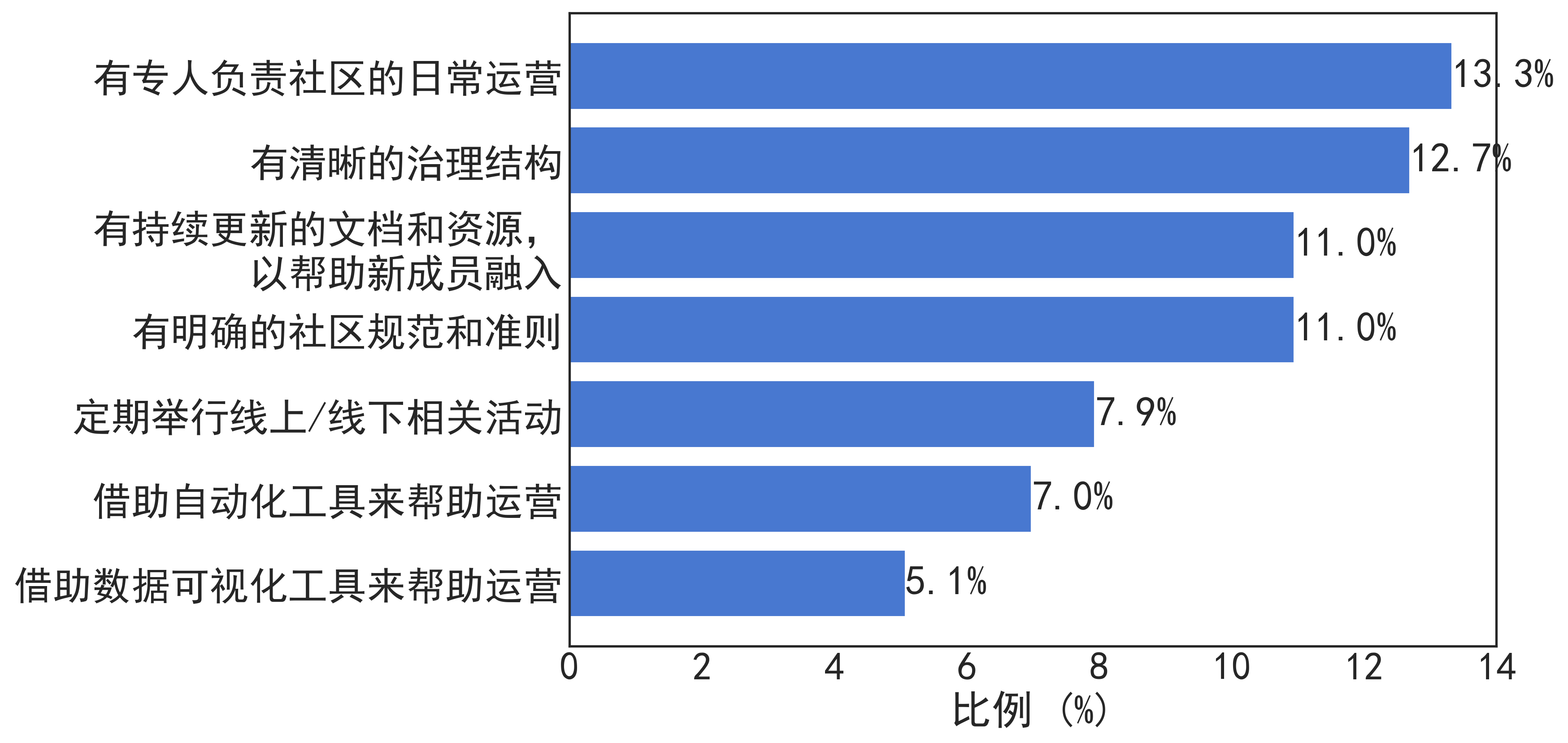 在社区管理方面,大约一半的社区拥有清晰的治理结构,并且有专人负责日常运营,这两项分别占到了 13.3%和 12.7%。同时,社区普遍重视规范和准则的制定,以及文档和资源的持续更新,以帮助新成员更好地融入,这两项的比例均为 11.0%。