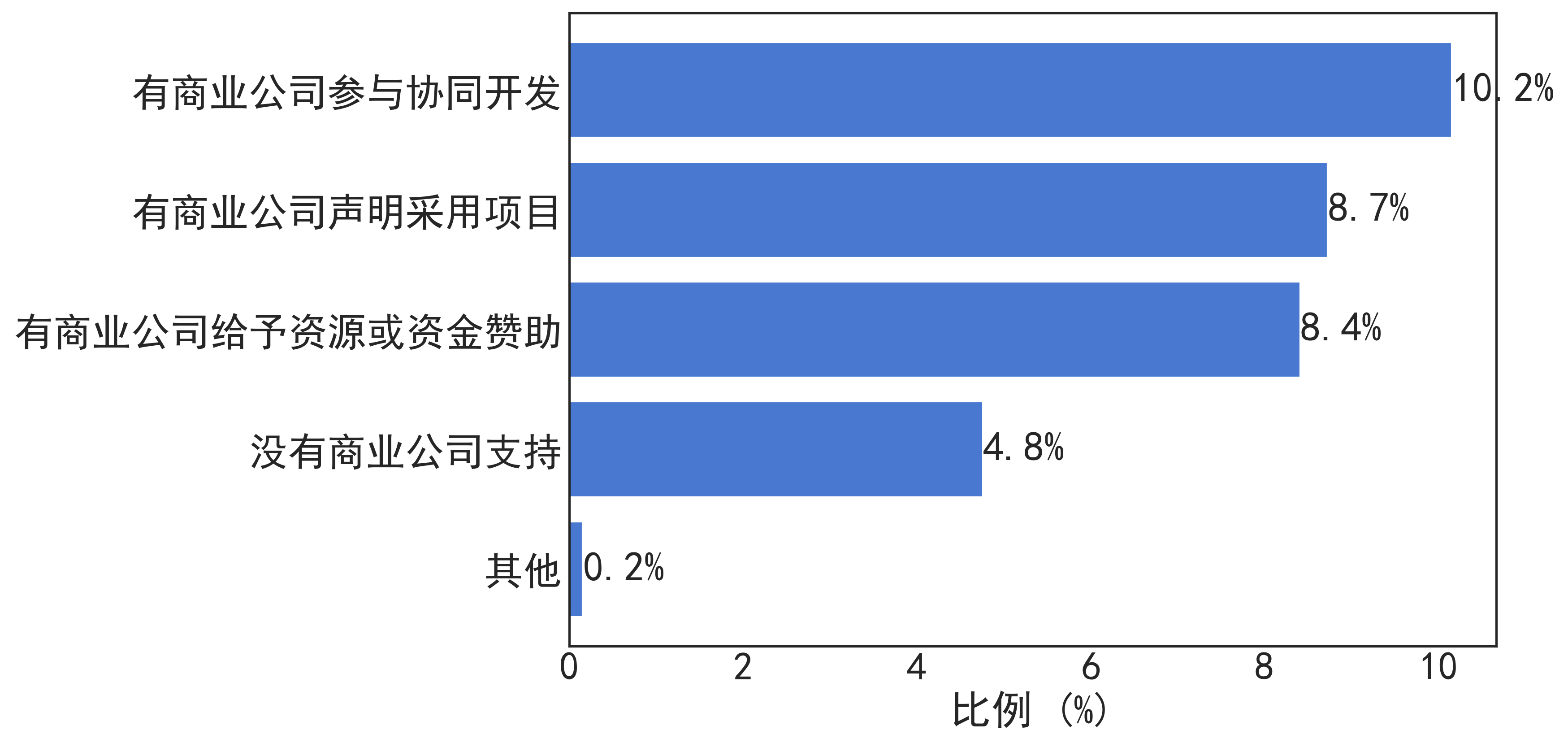 在商业公司的支持方面,大多数开源社区得到了商业公司的积极参与和支持。其中,10.2%的社区有商业公司参与协同开发,8.7%的社区得到了商业公司的声明采用,8.4%的社区获得了商业公司的资源或资金赞助。然而,也有4.8%的社区表示没有得到商业公司的支持,而“其他”类别仅占0.2%。