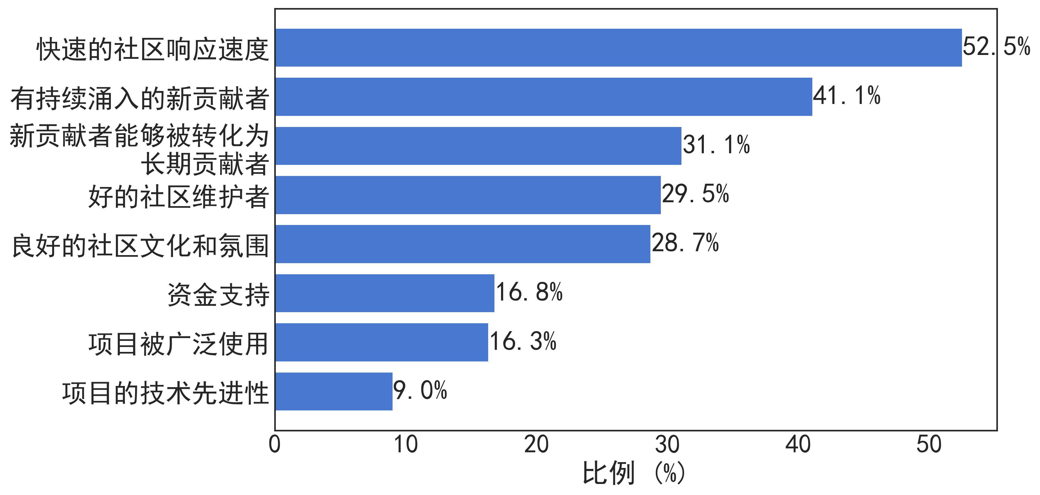 总体而言,受访者普遍认为,影响开源社区健康持续发展的关键因素包括快速的社区响应速度、持续涌入的新贡献者以及新贡献者能够被有效转化为长期贡献者,这些因素的比例分别为 52.5%、41.1%和 31.1%。