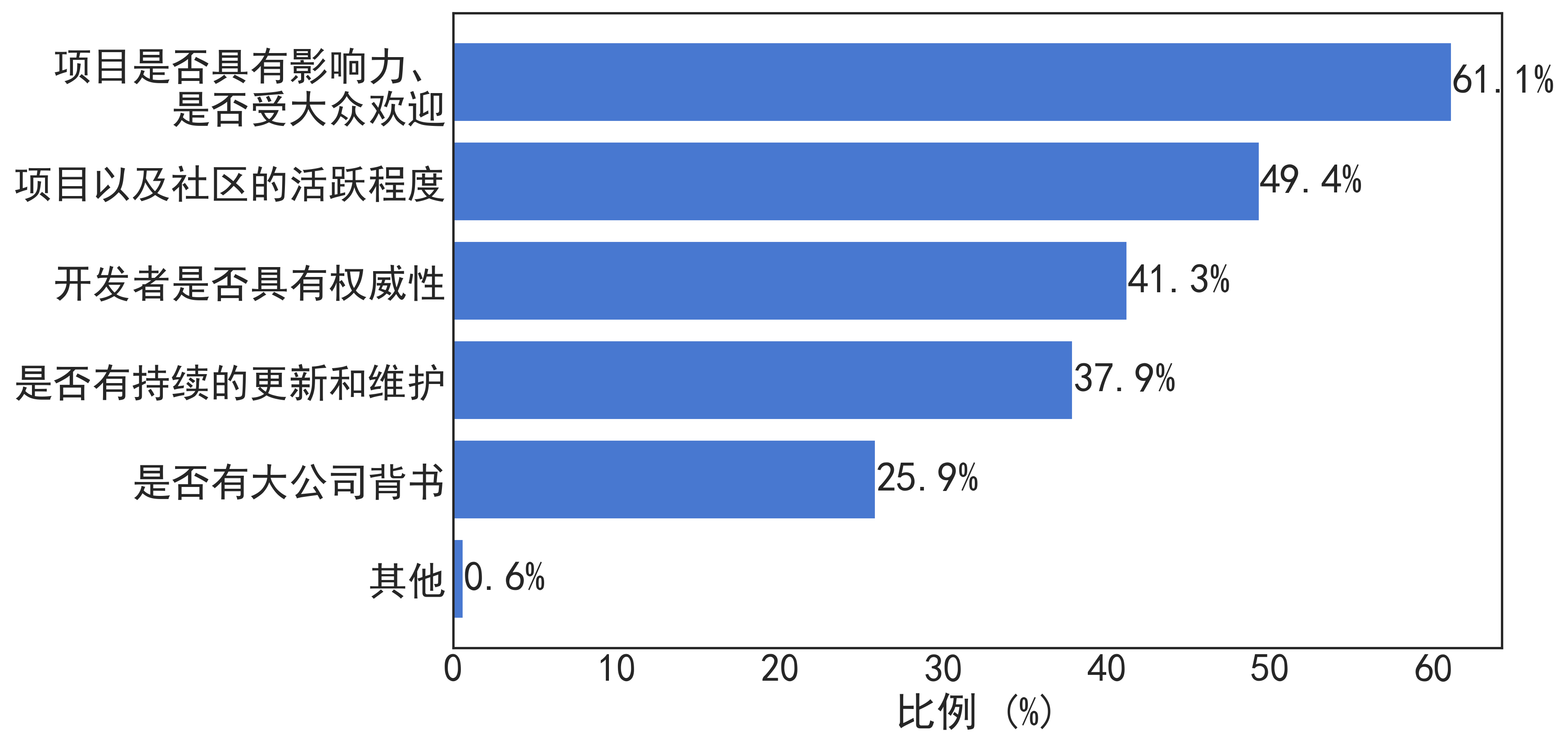 在评价开源项目时,受访者主要关注项目的影响力和受欢迎程度、项目及社区的活跃程度、开发者的权威性以及项目是否有持续的更新和维护,这些因素的比例分别为 61.1%、49.4%、41.3%和 37.9%。这些关注点反映了开发者对于项目在技术实力、社区参与度和长期可维护性方面的综合考量。