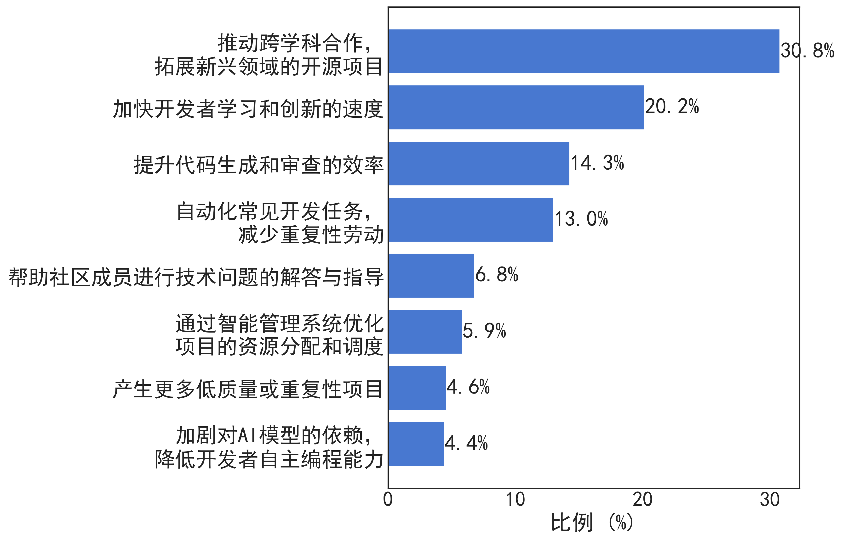 人工智能技术对开源项目和社区产生了深远的影响。其中,最显著的是推动了跨学科合作,拓展了新兴领域的开源项目,这一影响占比达到了 30.8%。其次,人工智能加快了开发者学习和创新的速度,占比 20.2%。此外,人工智能还提升了代码生成和审查的效率(14.3%),自动化了常见开发任务以减少重复性劳动(13.0%),并帮助社区成员进行技术问题的解答与指导(6.8%)。然而,也有 4.6%的受访者担心 AI 可能导致产生更多低质量或重复性项目,以及 4.4%的受访者担心这会加剧对 AI 模型的依赖,降低开发者自主编程能力。