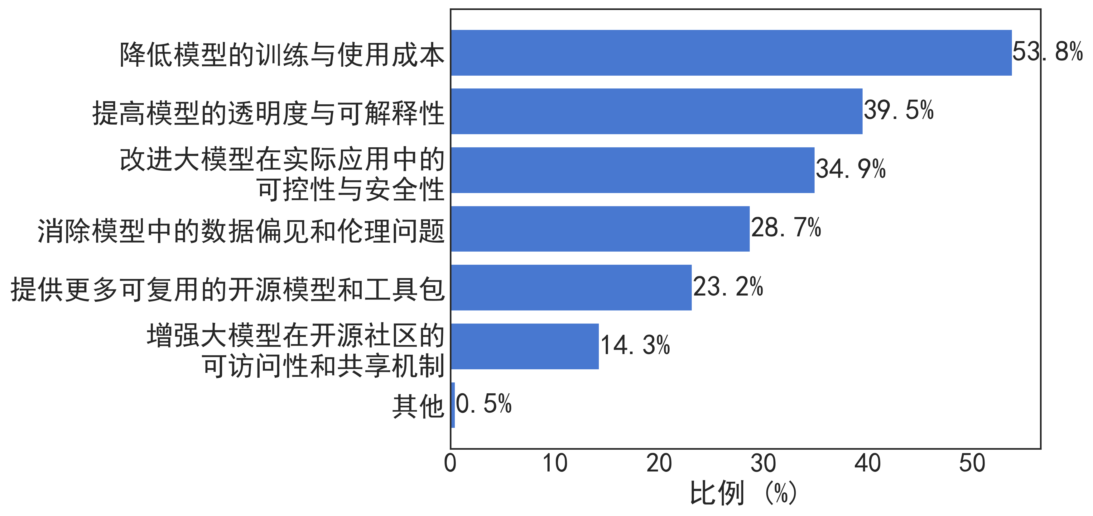 在开源大模型的发展过程中,面临的技术挑战众多。最迫切需要解决的是降低模型的训练与使用成本,这一挑战占比高达 53.8%,指出了在大规模部署和使用AI模型时面临的经济障碍。提高模型的透明度与可解释性也是一个重要挑战,占比 39.5%,关系到模型的可信度和用户对 AI 决策的理解。此外,改进大模型在实际应用中的可控性与安全性(34.9%)和消除模型中的数据偏见和伦理问题(28.7%)同样重要,这涉及到模型的稳定性和防止滥用。提供更多可复用的开源模型和工具包(23.2%)以及增强大模型在开源社区的可访问性和共享机制(14.3%)也是推动社区发展的关键因素。这些挑战的解决将有助于开源大模型的健康发展和广泛应用。